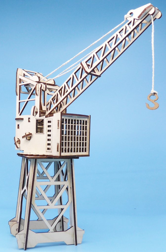 Approximately 30cm tall, adjustable jib, working winch, rotary cabin with opening door and the whole thing rolls on boogie wheels. Easily assembled from 43 press-out pieces of superior 3mm laser-cut birch ply, a sustainable material.