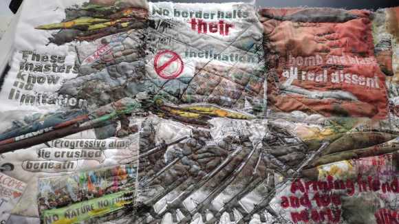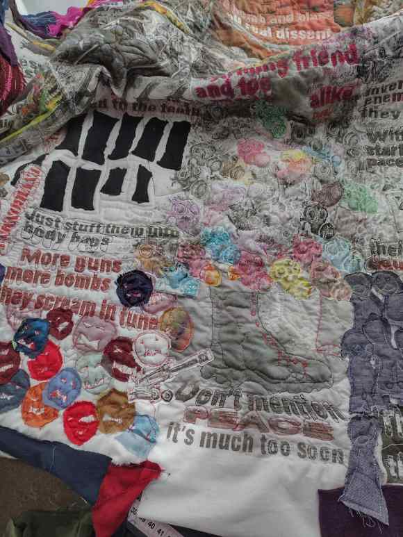 Most of the work for this quilt was complete months ago but current events are spurring me to finish. I’m mainly adding borders at the moment but there will be more work after that, pens and stitch and some discharge paste to remove colour in a few places. It can be hard to know when to stop! The original poem was written long ago, it’s on this site in artist’s book form.