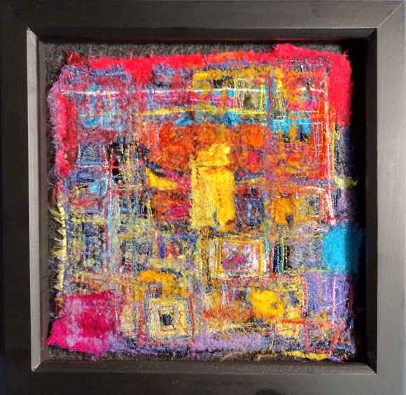 Almost all the pieces in the Meltdown series are reworked from earlier fabric work, I don’t throw much away. I try to avoid polyester but for shine it does get into the mix. Rayon (viscose) thread and cloth can be shiny and I use that where I can, although rayon sewing thread is usually thinner and therefore weaker than cotton or polyester, I don’t know why that is. Silk is best but pure colour scraps can be hard to find. Viscose in clothing is often silky and now frequently used for fast-fashion clothing, also used in place of cotton, it was developed in the 19thC as a substitute for silk but has many other uses. Being made from wood pulp it’s potentially an organic fabric but the manufacturing process is intense and involves a number of chemicals. As with bamboo fabric – also viscose – there may be potential for a more environmentally friendly manufacturing process.