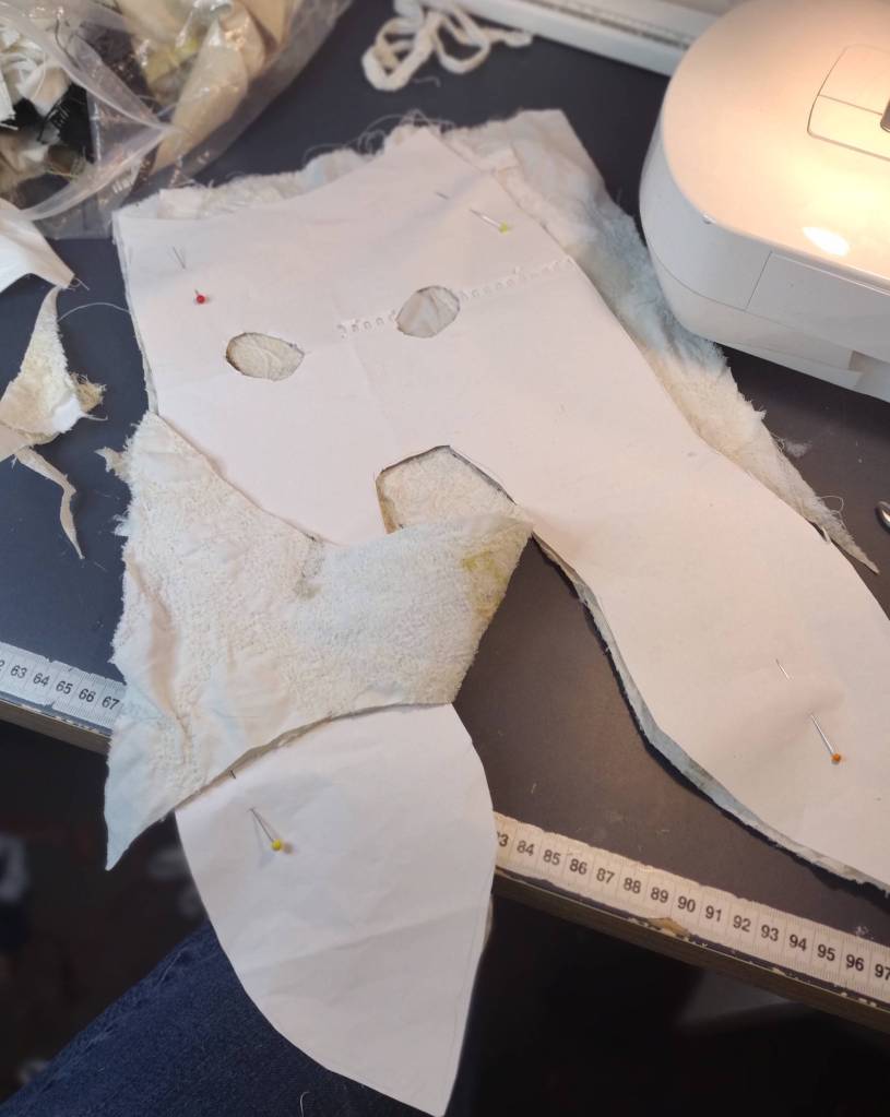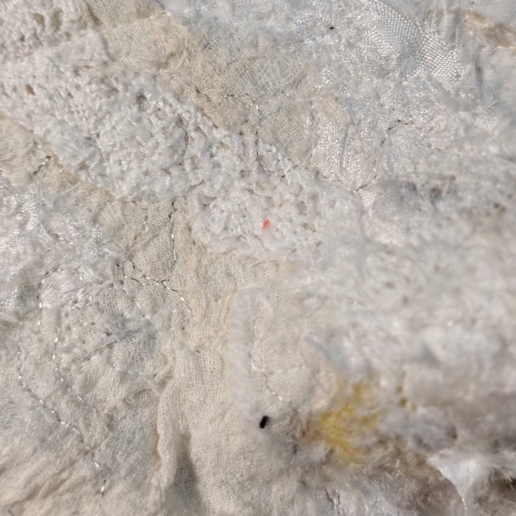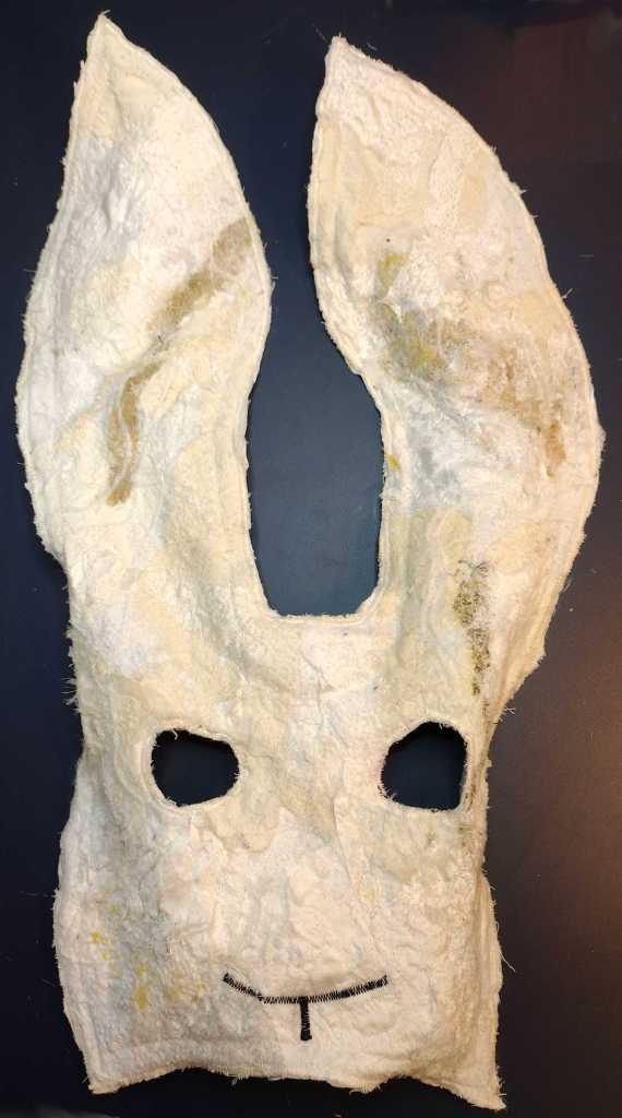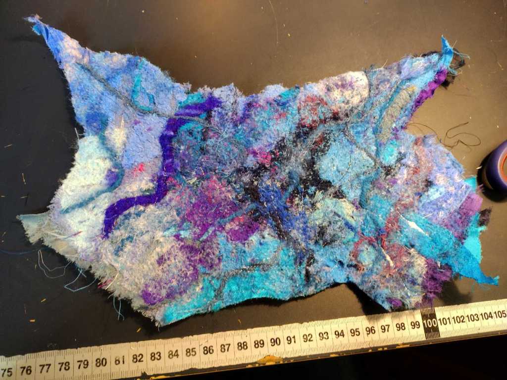 I’m working here with silk, bamboo and cotton scraps, some of these are tiny or little swatches. The process is fairly quick, an hour or two is enough to create a piece suitable for the hare masks I have been making. The primary aim here is texture and the small amount of colours other than cream or white should help with that. The silk is making my hands feel er, silky which I guess is an effect of the way these materials have been treated in the finishing process.