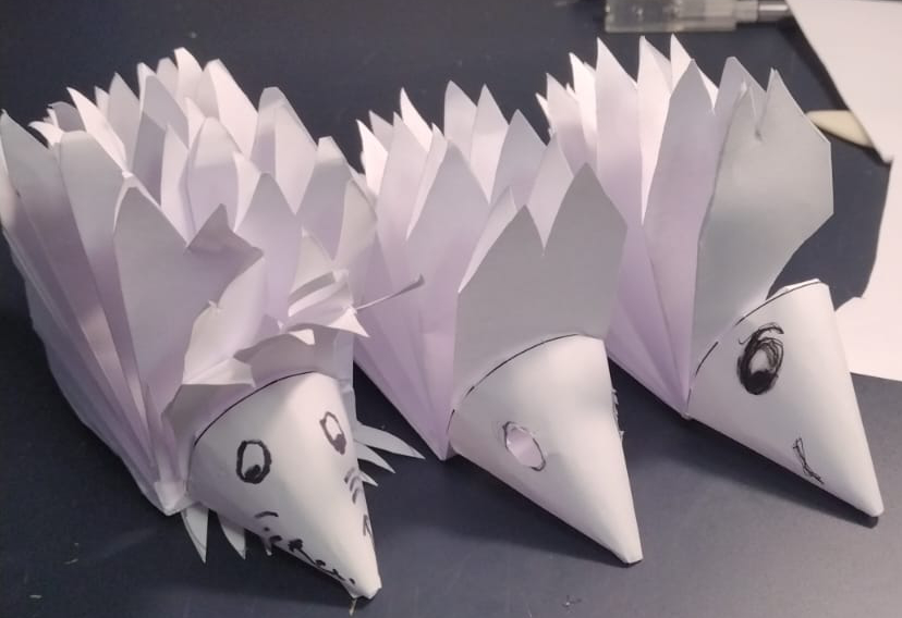 These are all trials, a child could do a better job with the folding, cutting and glue! The body is fan-folded using one sheet of A4 then opened out and the edges snipped to make the hedgehog spines, some oval shapes cut out on the folds to allow light from a led fairy light or led candle. The head is a slightly flattened cone from a second sheet of paper – I managed to get four from one A4 sheet – with tabs left to enable it to be glued to the fan-body end.