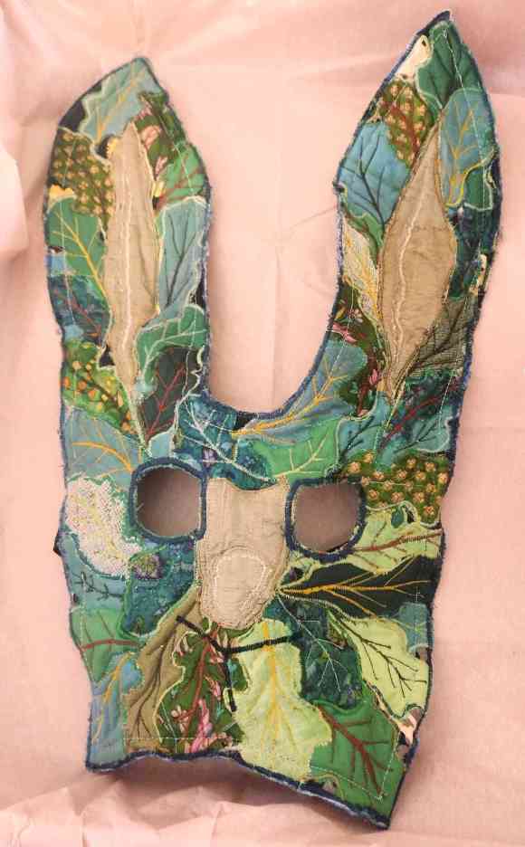 Hare (Green Man) Mask, about 43 x 30 cm, mixed textiles and wire frame.