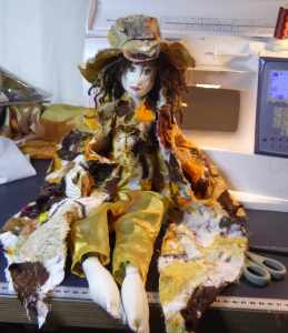 There is something I find satisfying and rewarding about doll making, although I can’t claim to know what that is. These four dolls are button-jointed in the Jan Horrox style, about 60 cm long, their clothes are made from embellished and embroidered scraps and may be much longer. The fabric scraps are often silk and satin and have many metallic threads but these shiny things do not show in these photos.