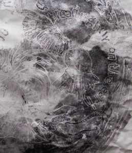 I think the real thing looks a bit better than this photo. Now working on another two or three collagraphs but not so big – the cost of paper can be prohibitive. This one is printed on ‘bread and butter’ paper (250 gsm) which is probably not really heavy enough for collagraph. I had some waste having printed with the paper too damp and had peeling as a result.